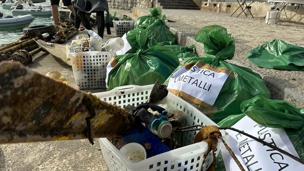Mare cristallino, in superficie. Ma nei fondali c’è di tutto: slip, costumi, vecchie maschere da sub, residui di cantieri edili come tubi dalmine, ferro, una scala probabilmente di una grossa nave. Ripescati diversi copertoni di auto e anche, come già l’anno precedente, quello di un camion. E poi un tappeto di bottiglie di vetro, lattine, piatti e bicchieri di plastica, sacchetti, etichette, tessuti vari.