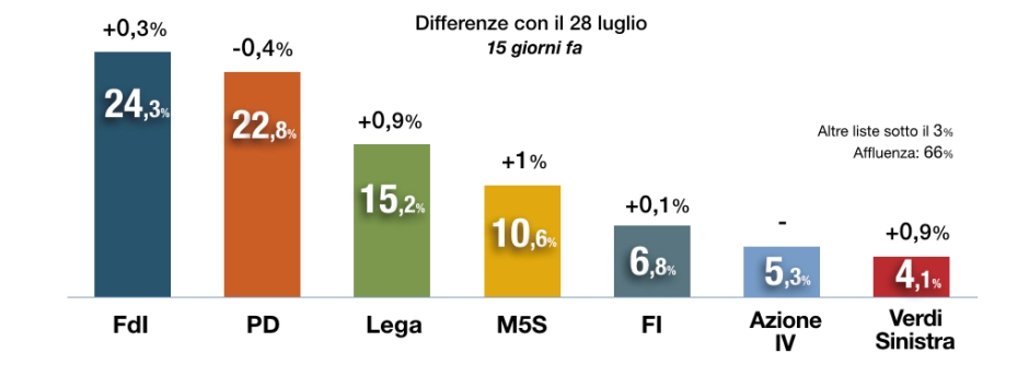 Se ci si recasse alle urne adesso, Fratelli d’Italia sarebbe con il 24,3% primo partito, un punto e mezzo in più del Partito Democratico, attestato al 22,8%. Al terzo posto, al 15,2%, la Lega; al 10,6% il Movimento 5 Stelle.