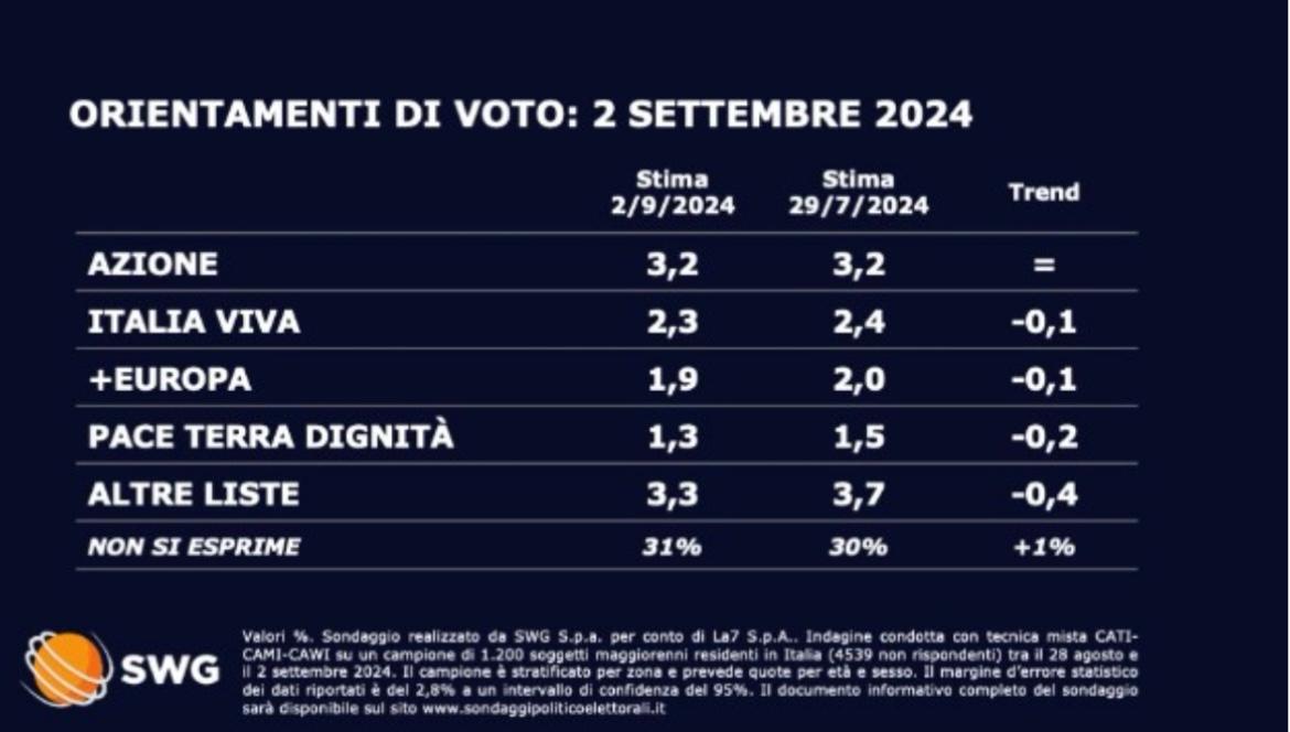 Per quanto riguarda i partiti minori Azione è stabile, scendono invece dello 0,1% Italia Viva, +Europa mentre tutti gli altri presentano un calo ancora più accentuato. E aumenta il numero di chi non si esprime, seppur di poco.
