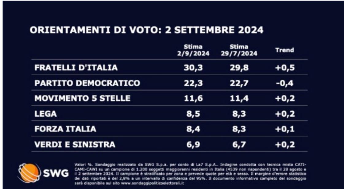 Complessivamente, rispetto al dato di fine luglio il centrodestra appare più forte, in calo invece il PD e tutti i partiti più piccoli. Fratelli d’Italia cresce dello 0,5%, il Pd cala dello 0,4%, il M5S cresce lievemente dello 0,2%. Crescono, seppur lievemente Lega e Forza Italia, rispettivamente dello 0,2% e 0,1%.