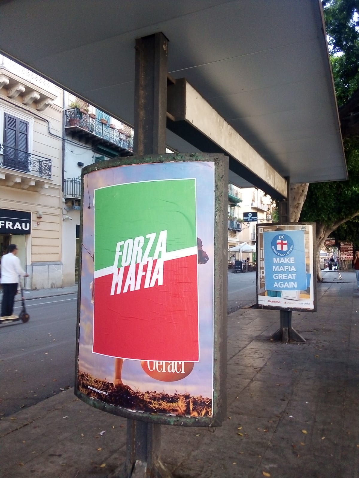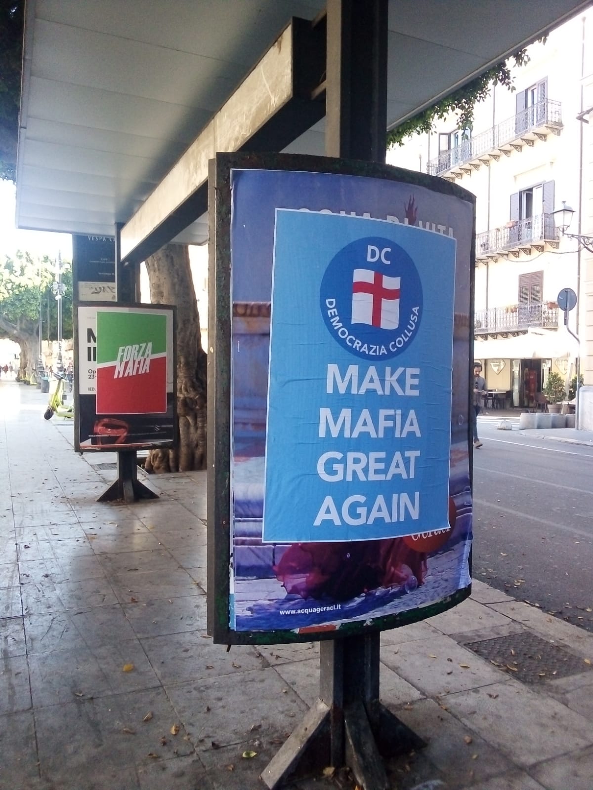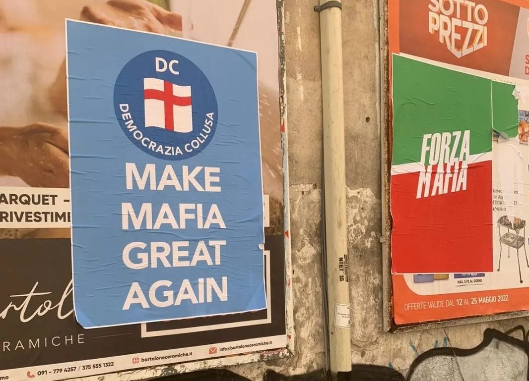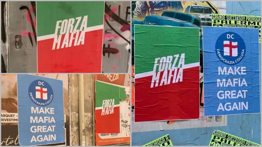 “Make mafia great again” con il logo della democrazia Cristiana che diventa “Democrazia collusa”. “Forza mafia” che richiama il logo del partito di Berlusconi. Il centro di Palermo si risveglia tappezzato di manifesti che prendono di mira il partito di Totò Cuffaro, la democrazia Cristiana Nuova, e Forza Italia.