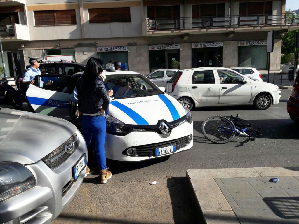 Nello scontro di fronte al giardino di largo degli abeti è rimasto coinvolto un ciclista del quale non si conoscono le condizioni.