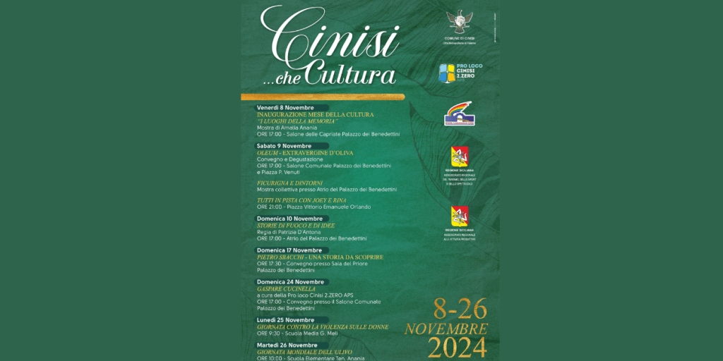 Il Comune di Cinisi, in collaborazione con la Pro Loco Cinisi 2.Zero APS e l’Istituto Comprensivo Cinisi, con il patrocinio della Regione Siciliana – Assessorato del turismo, dello sport e dello spettacolo e Assessorato alle attività produttive – inaugura un mese di eventi culturali dal titolo “Cinisi… che Cultura”.