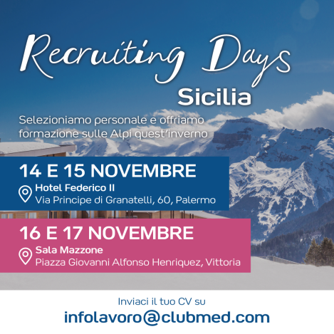 La società Club Med è alla ricerca di nuovo personale per le sue strutture ricettive, per la stagione invernale sulle Alpi. Per l’occasione ha organizzato nell’isola 4 giornate di recruiting, in particolare a Palermo e Vittoria (RG).