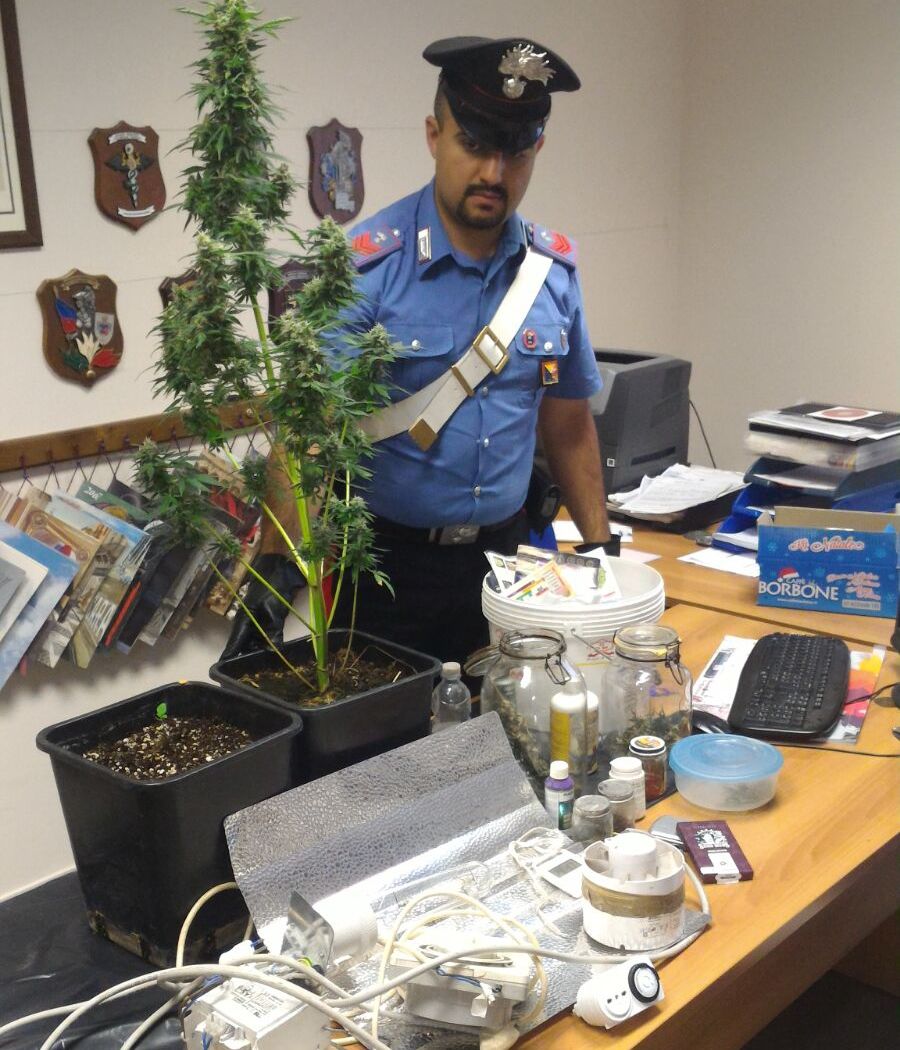 In particolare, i militari dell’Arma hanno ritenuto opportuno procedere ad una perquisizione domiciliare, a seguito della quale, in una stanza adibita a piccola serra con lampade alogene è stata rinvenuta una pianta di cannabis, 5 germogli, 15 grammi circa di sostanza stupefacente del tipo marijuana ed un un bilancino di precisione nonché del materiale vario per il confezionamento.