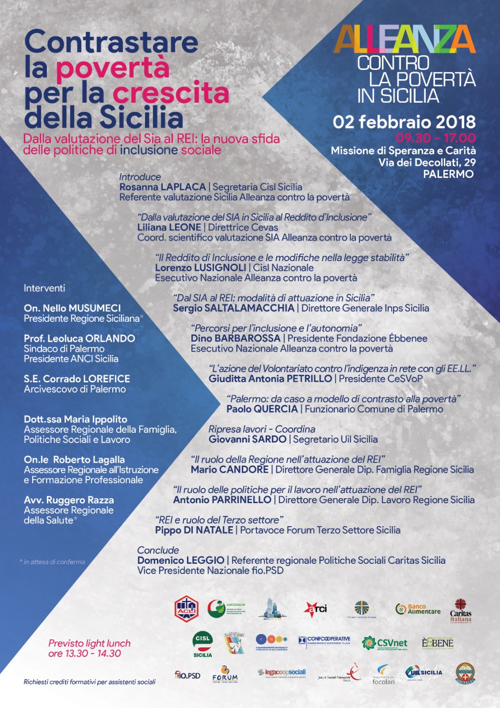 Inoltre, Leoluca Orlando, sindaco di Palermo e presidente dell’Anci Sicilia e l’arcivescovo di Palermo, Corrado Lorefice, che a Biagio Conte nei giorni della protesta ha portato solidarietà e sostegno pastorale. Prenderanno quindi la parola: Lorenzo Lusignoli, della Cisl nazionale e dell’esecutivo nazionale dell’Alleanza contro la povertà, su Il Reddito d’inclusione e le modifiche alla legge stabilità; Sergio Saltalamacchia, direttore generale dell’Inps regionale (Dal Sia al Rei: modalità di attuazione in Sicilia); Dino Barbarossa, presidente della Fondazione Ébbene e componente dell’esecutivo nazionale dell’Alleanza, che parlerà di Percorsi per l’inclusione e l’autonomia. Giuditta Antonia Petrillo, presidente del CeSVoP, si soffermerà su L’azione del volontariato contro l’indigenza, in rete con gli enti locali. Mentre Paolo Quercia, funzionario del comune di Palermo, farà un focus sulla città: Palermo, da caso a modello di contrasto alla povertà.