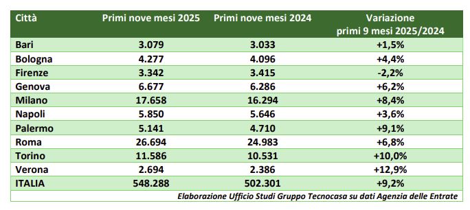 L’Ufficio Studi Tecnocasa ha analizzato i dati diramati dall’Agenzia delle Entrate sui primi nove mesi del 2025. In Italia sono state compravendute 548.288 abitazioni, con un aumento del 9,2% rispetto allo stesso periodo dell’anno scorso. Situazione abbastanza simile se si guarda solo al terzo trimestre del 2025, con un aumento dell’8,5% delle compravendite a livello nazionale.
