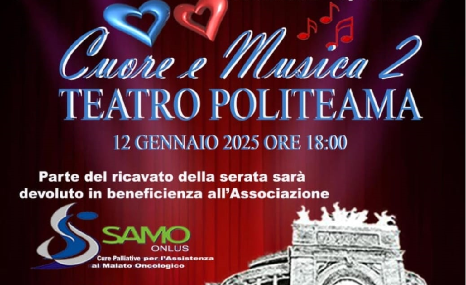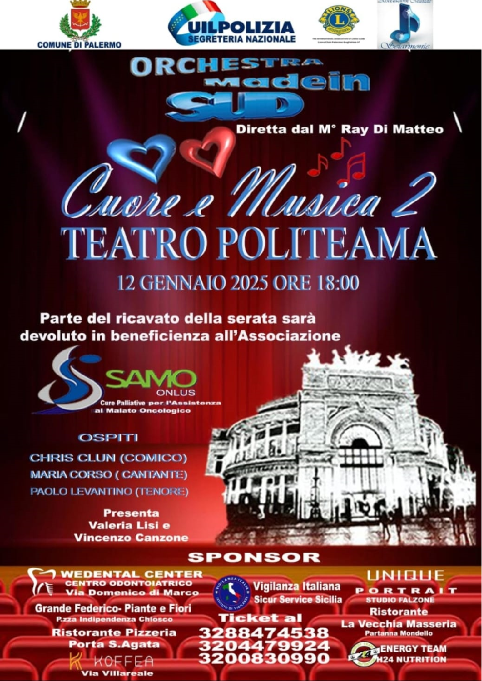 La seconda edizione di “Cuore e musica” con l’orchestra Made in Sud andrà in scena il prossimo 12 gennaio 2025. Numerosi ospiti e sorprese intratterranno il pubblico al teatro Politeama Garibaldi a Palermo, il cui ricavato sarà devoluto alla Samo Onlus (società per l’assistenza del malato oncologico). Tra gli artisti presenti sul palco il comico Chris Clun, la cantante Maria Corso e il tenore Paolo Levantino.