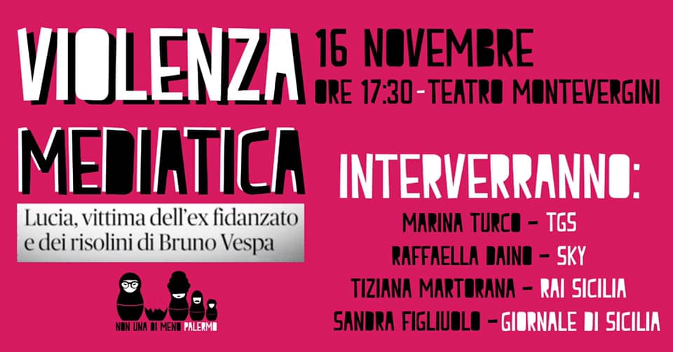 Domani 16 novembre alle ore 17.30, nei locali dell’atelier del Teatro Montevergini, le donne palermitane incontreranno alcune fra le più note giornaliste del territorio per discutere insieme di violenza mediatica. L’incontro è organizzato da Non una di meno Palermo e si inserisce nel quadro di tutte quelle iniziative e quei momenti di piazza che mirano ad esternare il forte dissenso contro la violenza di genere intesa quale strutturale e politica perché diretto riflesso di un sistema socio-politico-economico maschilista, capitalista e patriarcale.