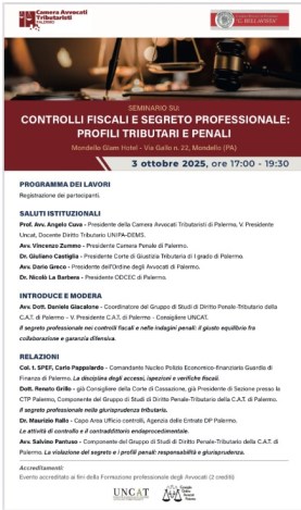 Domani 3 ottobre 2025, alle 17, al Mondello Glam Hotel in via Gallo 22, Mondello, si terrà il seminario sul tema “Controlli fiscali e segreto professionale: profili tributari e penali” organizzato dalla camera avvocati tributaristi di Palermo e dalla camera penale “G. Bellavista”, con il patrocinio del consiglio dell’ordine degli avvocati e dell’Uncat.