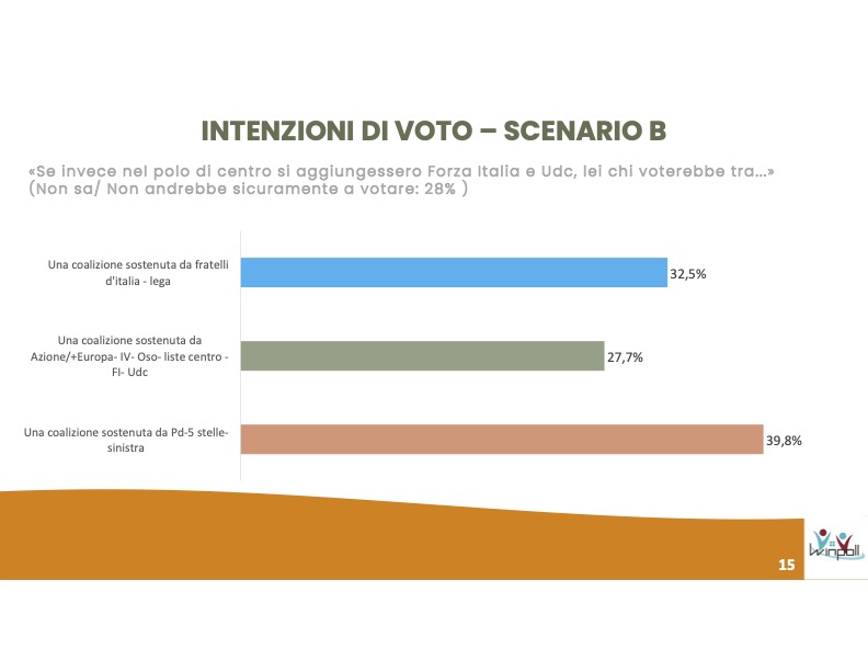 Sono due gli scenari analizzati: nel primo una coalizione sostenuta da Fi, Udc, Fdi e Lega (che otterrebbe il 40,4 per cento), una coalizione sostenuta da Azione, Più Europa, Iv, Oso e Liste Centro (che otterrebbe secondo il sondaggio il 20,2 per cento) e infine una coalizione sostenuta da Pd, M5S e Sinistra (che avrebbe il 39,4 per cento). In questo caso il candidato preferito del Terzo Polo sarebbe Fabrizio Ferrandelli con il 70,4%, seguito dal senatore Davide Faraone con il 22,3 per cento e da Saverio Romano con il 7,3 per cento.