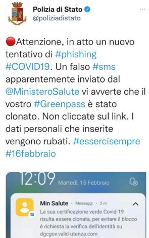 La Polizia postale mette in guardia su una nuova tipologia di phishing, che sfrutta la comunicazione del Ministero della salute per l’invio al cittadino del link al download del green pass.