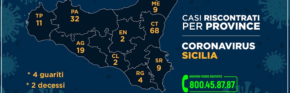 Risultano ricoverati 53 pazienti (quattordici a Palermo, ventitré a Catania, cinque a Messina, uno a Caltanissetta, tre ad Agrigento, due a Enna, due a Siracusa e tre a Trapani) di cui 11 in terapia intensiva, mentre 97 sono in isolamento domiciliare, quattro sono guariti e due deceduti.