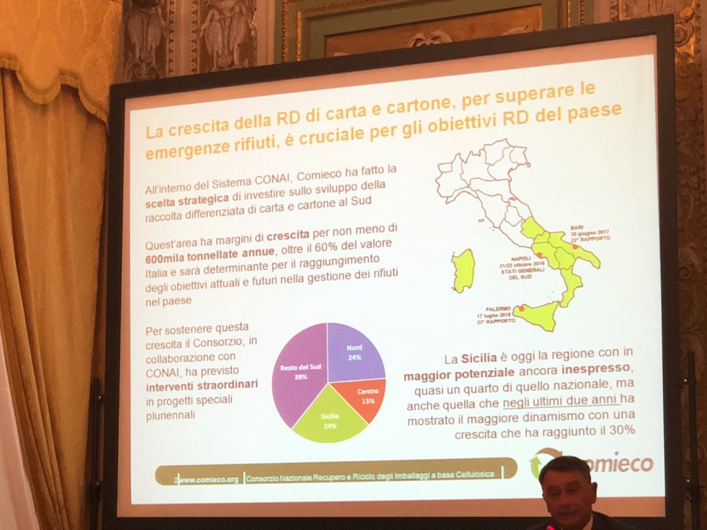 “Oggi – aggiunge – la percentuale di carta e cartone raccolta in Sicilia è del 22%. Si è passati dalle 95.654 tonnellate del 2016 alle 111.051 del 2017. Questo vuol dire che molto è stato fatto, ma che ancora molto c’è da fare. L’Isola, infatti, ha ancora enormi potenzialità, perché i margini di crescita sono ampi. Basti pensare che la media nazionale, con il 42%, è superiore di ben 20 punti. Mentre siamo ultimi in quanto a raccolta media pro capite con 22 kg. La prima regione è l’Emilia Romagna con 86,8”.