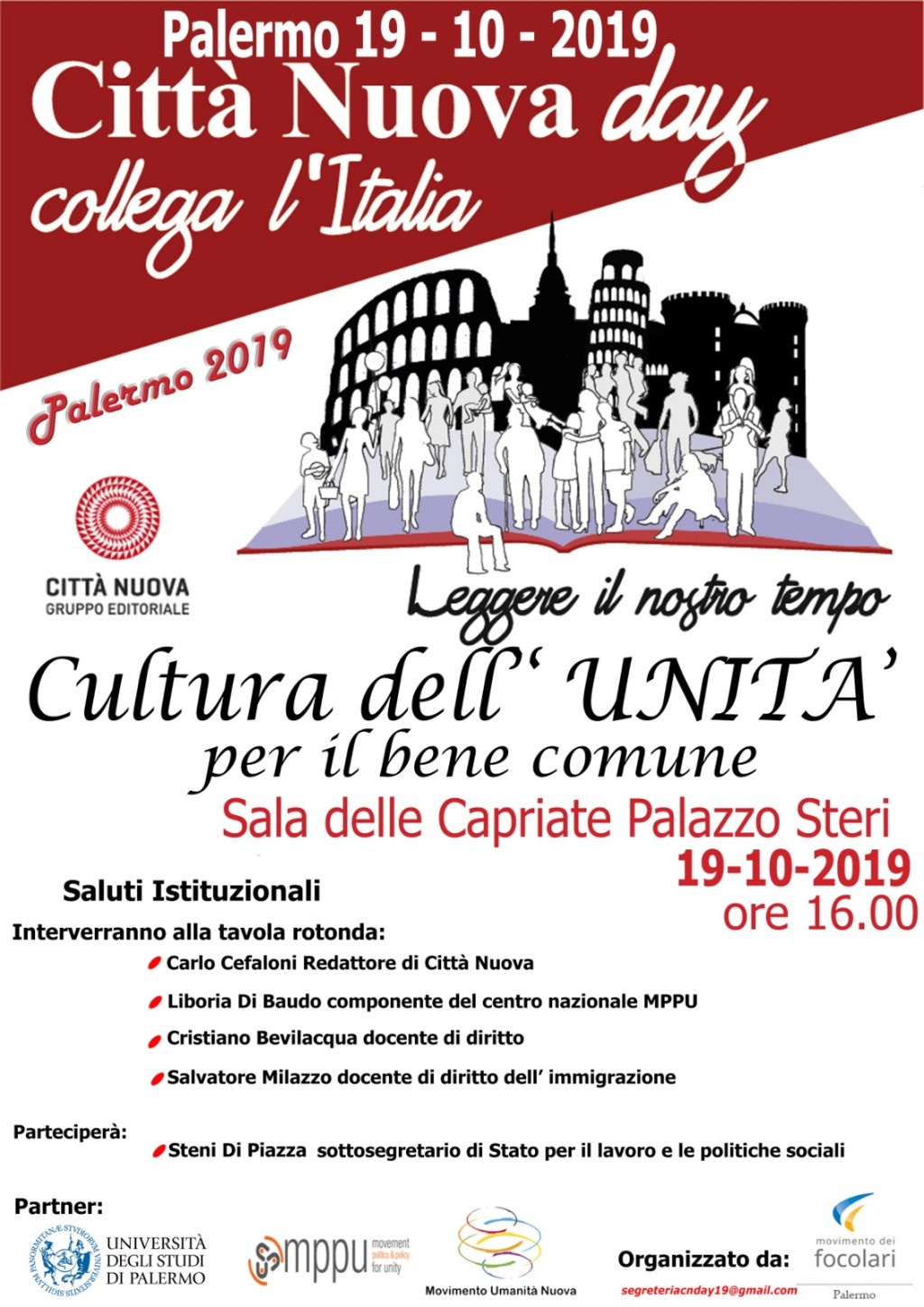 Interverranno: Fabrizio Micari Magnifico Rettore dell’Università degli Studi di Palermo. Introdurrà Carlo Cefaloni redattore Città Nuova Steni Di Piazza sottosegretario di Stato per il lavoro e le politiche sociali Salvatore Milazzo docente alla LUMSA di diritto dell’immigrazione Liboria Di Baudo componente nazionale del movimento politico dell’unità (MPPU) Cristiano Bevilacqua docente alla LUMSA di diritto seguiranno esperienze di cittadinanza attiva svolti a Palermo.