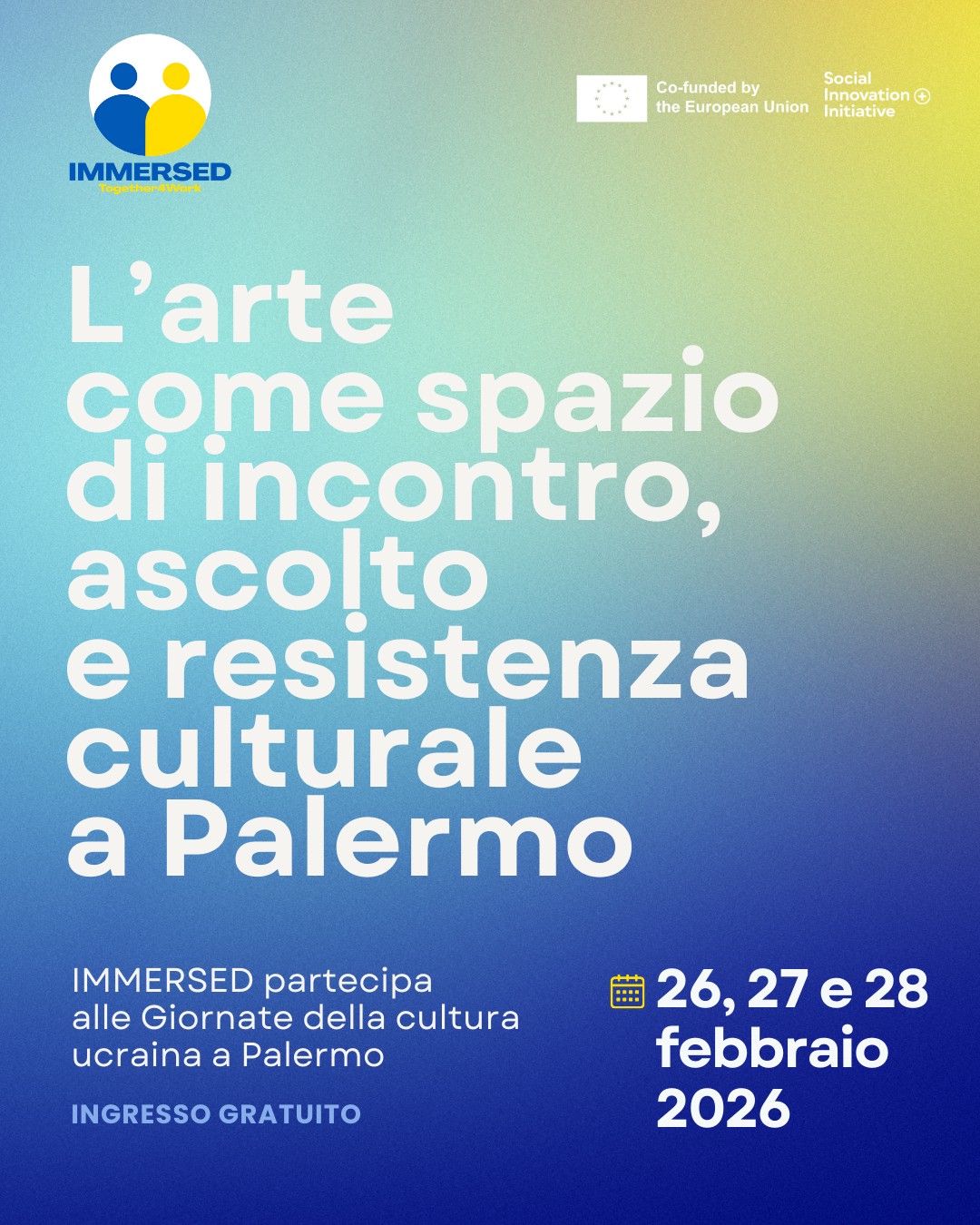 Nell’ambito della terza edizione delle Giornate della cultura ucraina a Palermo (20–28 febbraio 2026, ingresso libero), ti invitiamo a partecipare a tre appuntamenti gratuiti che si terranno il 26, 27 e 28 febbraio in diversi spazi della città. Ognuna delle tre giornate si aprirà con la presentazione del progetto IMMERSED – promosso dal CESIE ETS e finanziato dall’ESF+ Social Innovation+ Initiative – che valorizza l’inclusione sociale e lavorativa, il dialogo interculturale e la partecipazione attiva attraverso attività che stimolano il benessere, come l’arte e la cultura.