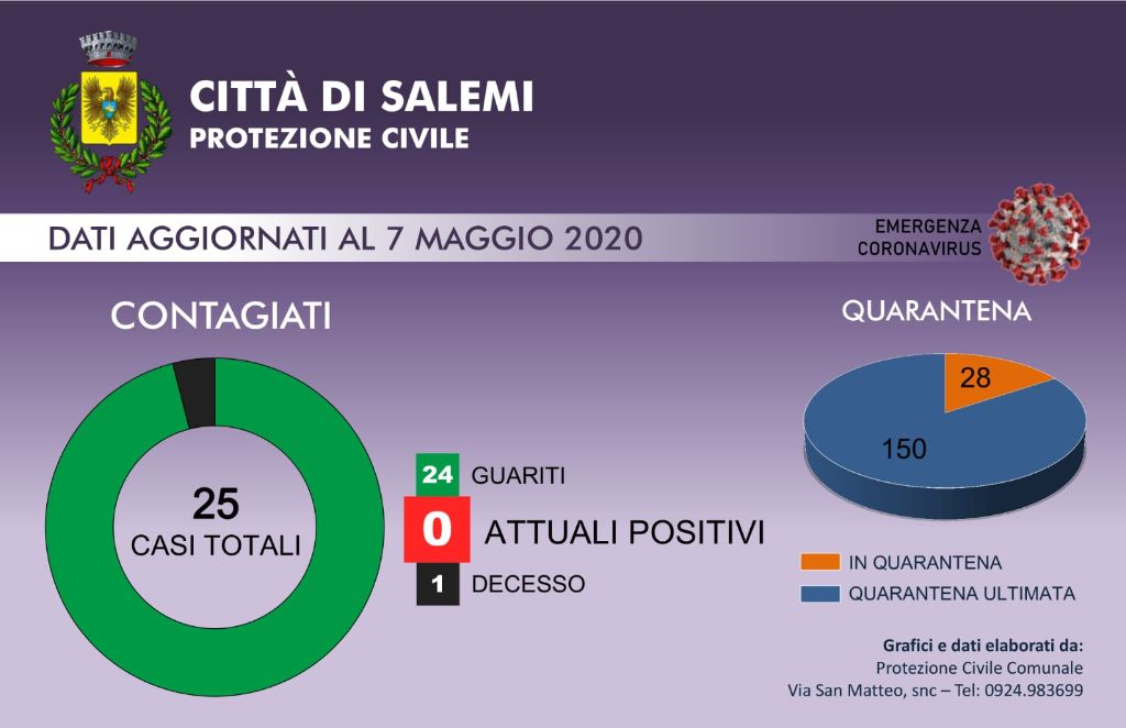 La fase dell’emergenza epidemiologica a Salemi si chiude quindi con 24 guarigioni e un decesso. “Sono state settimane difficili per la città ma siamo riusciti a venirne fuori grazie anche al lavoro dell’Asp, che ci ha dato un valido sostegno attraverso il suo dipartimento di Prevenzione, e all’impegno di tutti i salemitani che sono stati capaci di mettere in campo disciplina di comportamento e un grande spirito di solidarietà reciproca – afferma Venuti -. Il risultato raggiunto è merito di tutti, adesso dobbiamo continuare con i comportamenti responsabili per evitare di tornare indietro: dobbiamo tenere alta la guardia”.