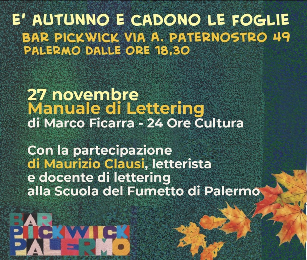 Nuovo incontro della rassegna del Bar Pickwick “E’ autunno e cadono le foglie” dedicata quest’anno alla letteratura ed al fumetto. Ospite della giornata di oggi a partire dalle 18,30 nei locali di via Alessandro Paternostro 49 a Palermo sarà Marco Ficarra con il suo “Manuale di Lettering” pubblicato per 24 ore cultura. L’artista palermitano/bolognese sarà accompagnato da Maurizio Li Causi letterista e docente di lettering presso la scuola del fumetto di Palermo.
