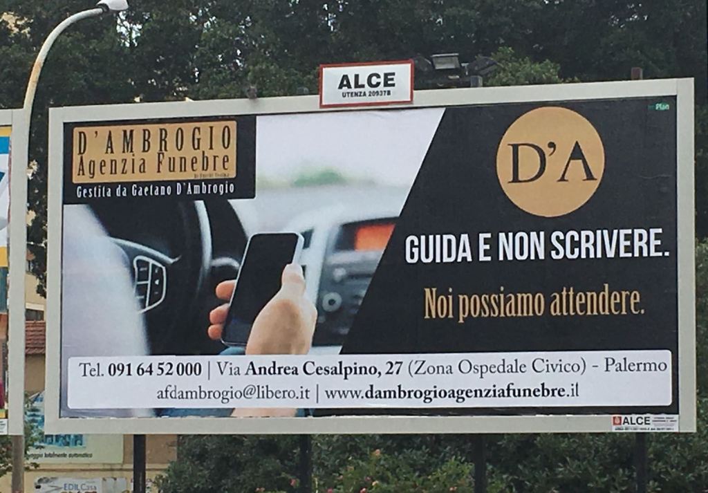 La fidelizzazione del cliente inizia da lì, dal prendersi cura della sua salute. Tanto prima o poi morirà, come tutti, e da noi dovrà venire, con i piedi in avanti. Così avranno pensato i titolari dell’agenzia funebre “D’Ambrogio” di Palermo, che hanno affisso un cartellone pubblicitario con “Guida e non scrivere.