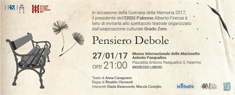 Venerdì 27 Gennaio, alle ore 21, presso il Museo Internazionale delle Marionette Antonio Pasqualino (Piazzetta Antonio Pasqualino 5), l’ERSU Palermo presenta l’evento dal titolo “Pensiero Debole”, uno spettacolo dell’associazione culturale Grado Zero, con ingresso libero.