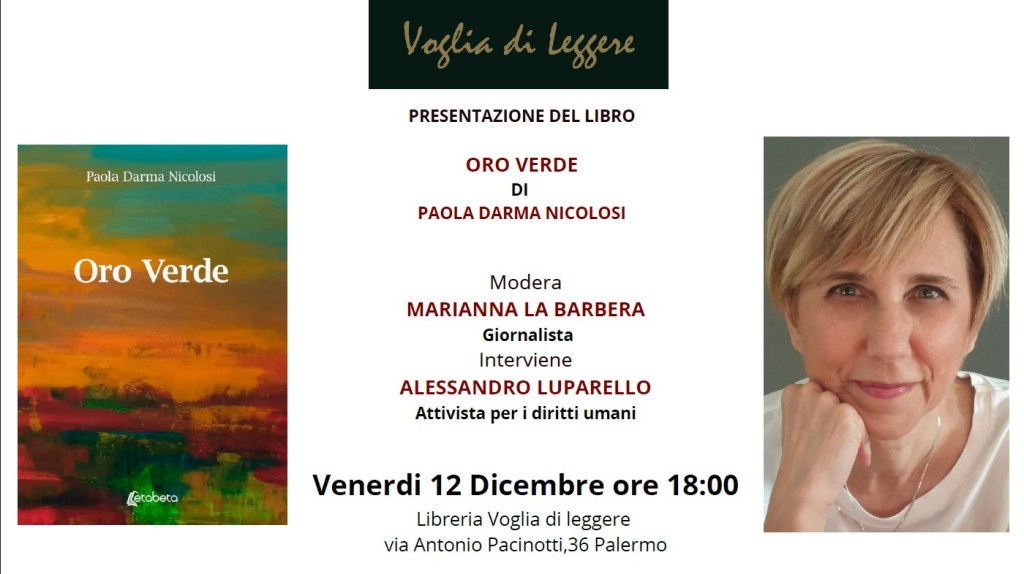 “Oro verde” è il titolo del libro di Paola Darma Nicolosi che sarà presentato venerdì 12 dicembre a Palermo, negli spazi della Libreria “Voglia di leggere”, in via Antonio Pacinotti 36 alle 18:00.