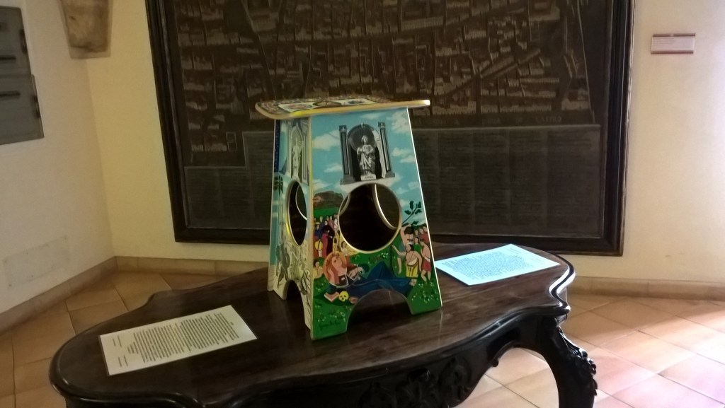 Un progetto che ha visto il recupero degli sgabelli dismessi e la loro decorazione artistica, con immagini iconografiche legate alle tradizioni popolari presenti nella cultura del carretto siciliano e dei dipinti su vetro degli ex voto. Dei 20 sgabelli prodotti, uno – realizzato da Giuseppe Di Natale e Salvatore Rotolo – andrà al Papa, mentre un altro (decorato con immagini iconografiche di Santa Rosalia) è stato giù donato all’Arcivescovo di Palermo, mons. Corrado Lorefice.