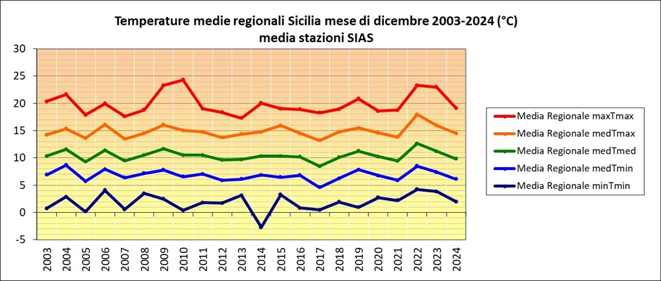 Sulla rete Sias il massimo valore di temperatura giornaliera, 23,5 °C, è stato registrato dalla stazione Lascari (Palermo) il giorno 13, in occasione di una delle uniche fasi caratterizzate da Scirocco, mentre il valore più basso, -7,0 °C, è stato registrato il 23/12 dalla stazione Linguaglossa Etna Nord (Catania). Pantelleria con 13,7 °C è stata la stazione con la temperatura media mensile più alta di tutta la regione”.