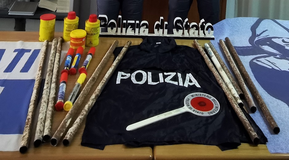 Nel corso della perquisizione sono stati trovati 10 tubi di metallo, fumogeni, fuochi pirici custoditi all’interno di uno zainetto ed alcuni striscioni di sostegno alla squadra, uno dei quali riportante la figura di un ultrà che indossa una felpa con cappuccio e tiene con la mano dietro la nuca una spranga.
