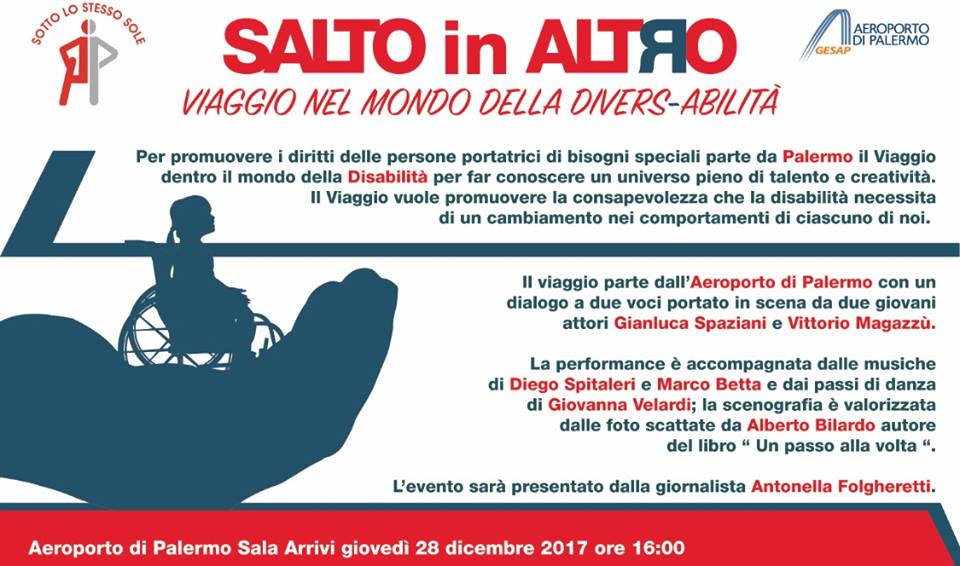 Alle 16 di domani, dalla sala Arrivi dell’Aeroporto di Palermo, l’associazione Sotto lo stesso sole punterà uno sguardo insolito sulla diversabilità con la manifestazione “Salto in altro”. Il Viaggio parte con un dialogo a due voci portato in scena da due giovani attori, Gianluca Spaziani e Vittorio Magazzù, che interpreteranno brani di Simonetta Agnello Hornby, Fiamma Satta, Karl Valentin, Italo Calvino e il monologo “Party time” di Harold Pinter. Gianluca Spaziani ha 24 anni ed è allievo della Scuola di Teatro diretta da Emma Dante. Vittorio Magazzù ha ricevuto recentemente il Premio Speciale Cinema “Nuovi Talenti” dedicato a Giuliano Gemma. La performance è accompagnata dalle musiche di Diego Spitaleri e dai passi di danza di Giovanna Velardi. La scenografia è volorizzata dalle foto scattate da Alberto Bilardo, autore del libro “Un passo alla volta”. L’evento sarà presentato dalla giornalista Antonella Folgheretti. Parcheggio gratuito per i partecipanti all’evento compreso area Auto con passeggeri disabili.