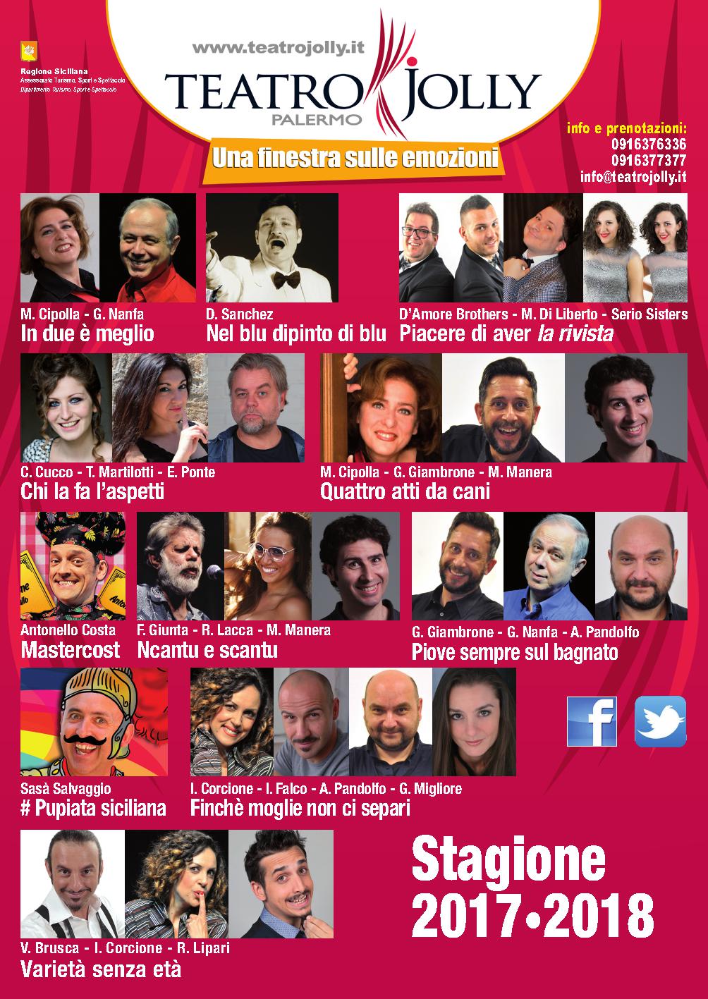 In cartellone nomi ormai consolidati della comicità made in Sicily come Sasà Salvaggio, Antonio Pandolfo, Ernesto Maria Ponte e le Serio Sister e volti che stanno prendendo sempre più campo nel panorama della risata di casa nostra come Roberto Lipari. Sul palco si celebra anche il ritorno a due anni di distanza di Diego Sanchez, attore, cantante, regista e produttore. Non mancherà di accompagnare le pièce anche la musica, elemento essenziale che scandisce il ritmo degli spettacoli del Teatro Jolly. Dal cantautore Francesco Giunta, già partner in diversi eventi, alla tromba di Benny Amoroso.