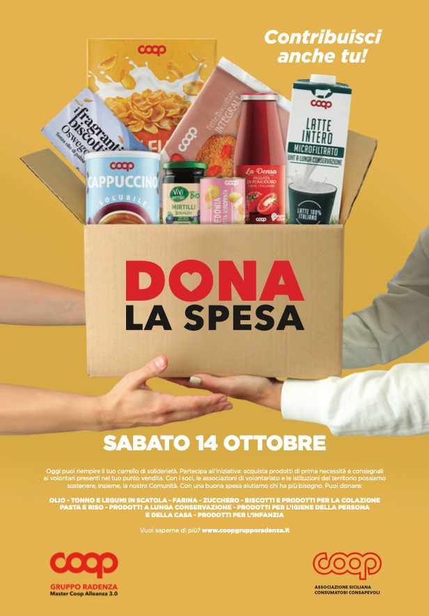 “Dona la spesa” è un progetto che Coop organizza in rete con le organizzazioni di volontariato del territorio. In Sicilia l’iniziativa è promossa da Coop Gruppo Radenza e dall’Associazione Siciliana Consumatori Consapevoli, l’organizzazione alla quale aderiscono i consumatori che sottoscrivono la Coop Card. Le donazioni andranno in favore di persone e famiglie in difficoltà, rimanendo all’interno degli specifici territori.
