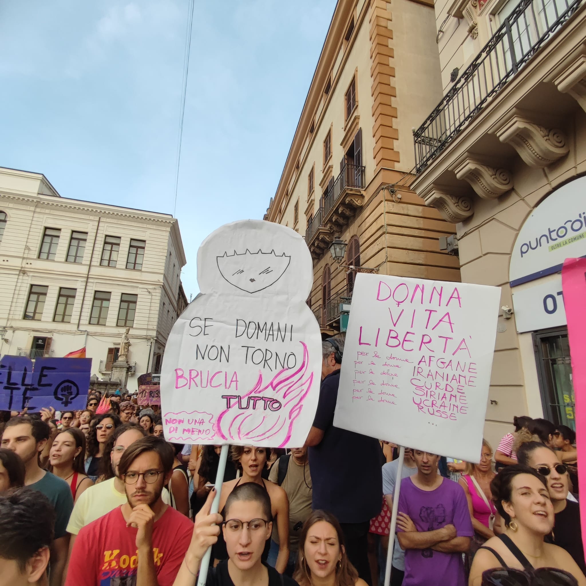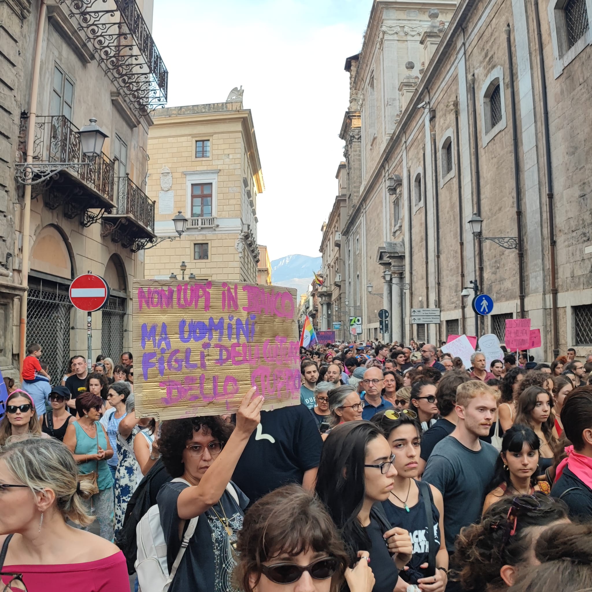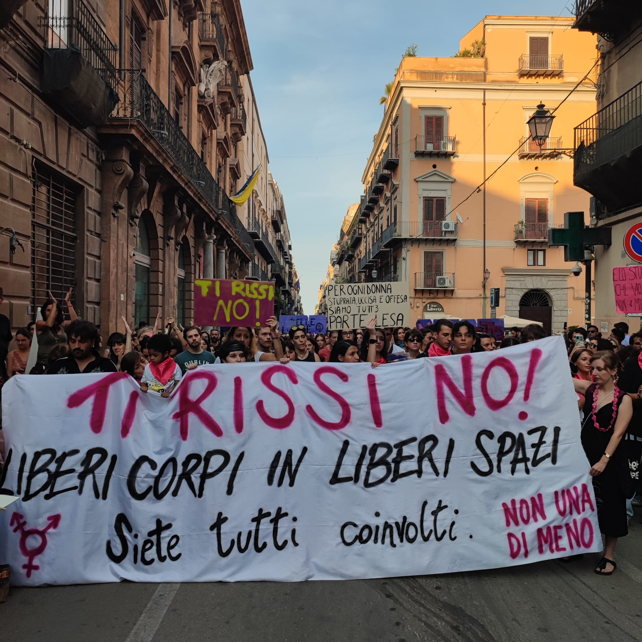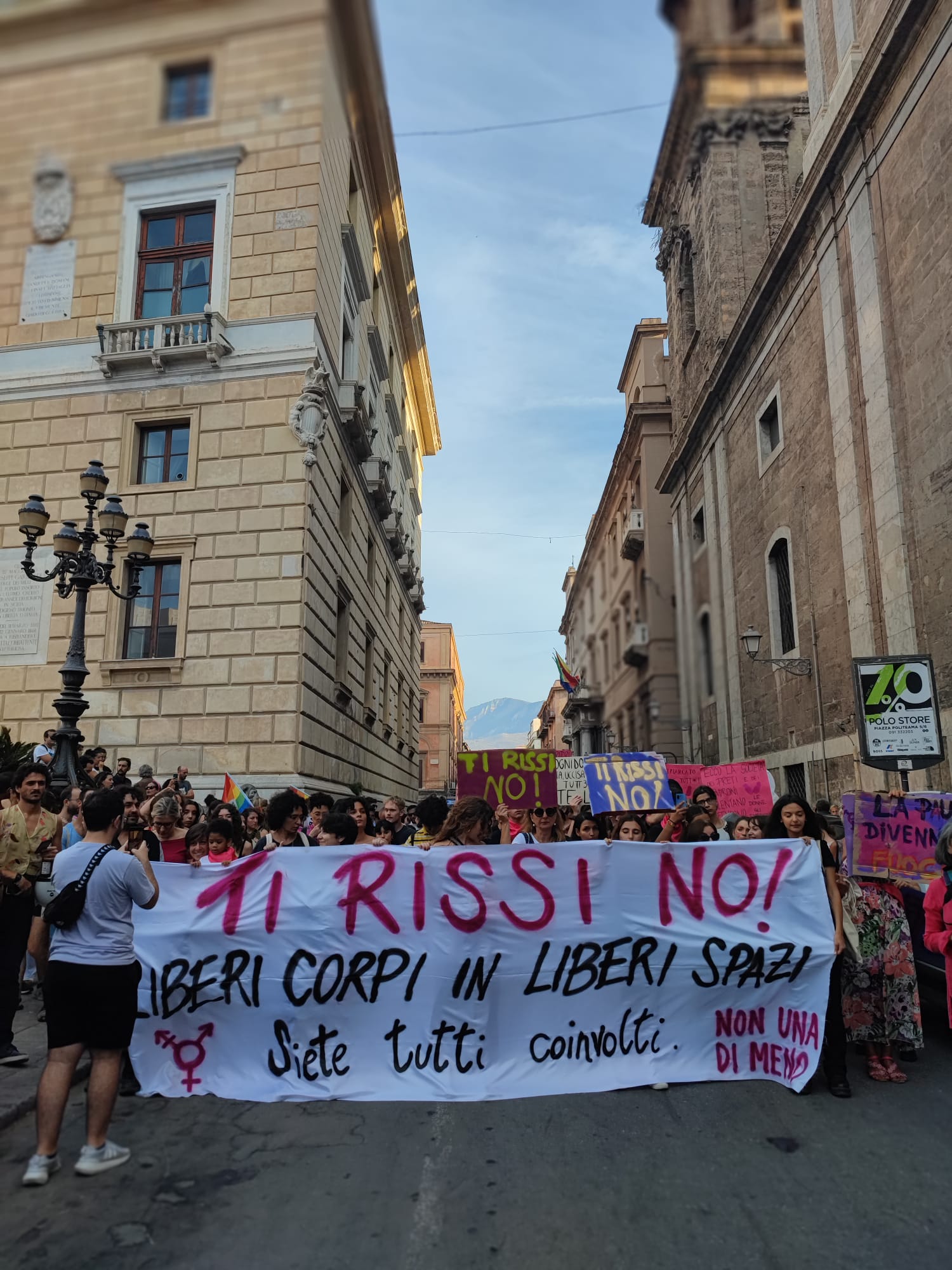 Erano partite in duecento dal concentramento ma sono arrivate alla fine del corteo in 800 o forse anche in mille. In tante, alla fine, hanno risposto alla chiamata del Coordinamento “Non una di Meno Sicilia” per il corteo di ieri pomeriggio a Palermo. Una marea che ha invaso le strade, si è riappropriata dello spazio pubblico e ha urlato un sonoro “TI RISSI NO!” , uno slogan usato per esprimere la rabbia dopo il tanto discusso caso di stupro del foro Italico e per solidarizzare con la vittima. Una protesta che, andando oltre il caso singolo, si estende a tutti gli attacchi sferrati in più modi e giornalmente da quello che le attiviste definiscono “il sistema patriarcale sui corpi e sulle vite delle donne e della comunità LGBTQIA+”.