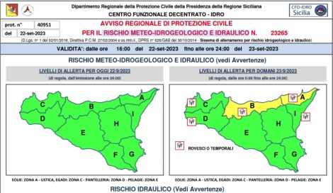 La Sicilia è ancora stretta nella morsa del caldo con temperature altissime ed oltre 40 roghi attivi ma sabato 23 settembre il clima dovrebbe cambiare. Sono attese, infatti, piogge e temporali con allerta gialla nel Palermitano e nel Messinese ma sono attese precipitazioni anche nel Catanese, Agrigentino e Trapanese. Lo indica l’avviso 23265 della protezione civile regionale sul rischio meteo-idrogeologico e idraulico.