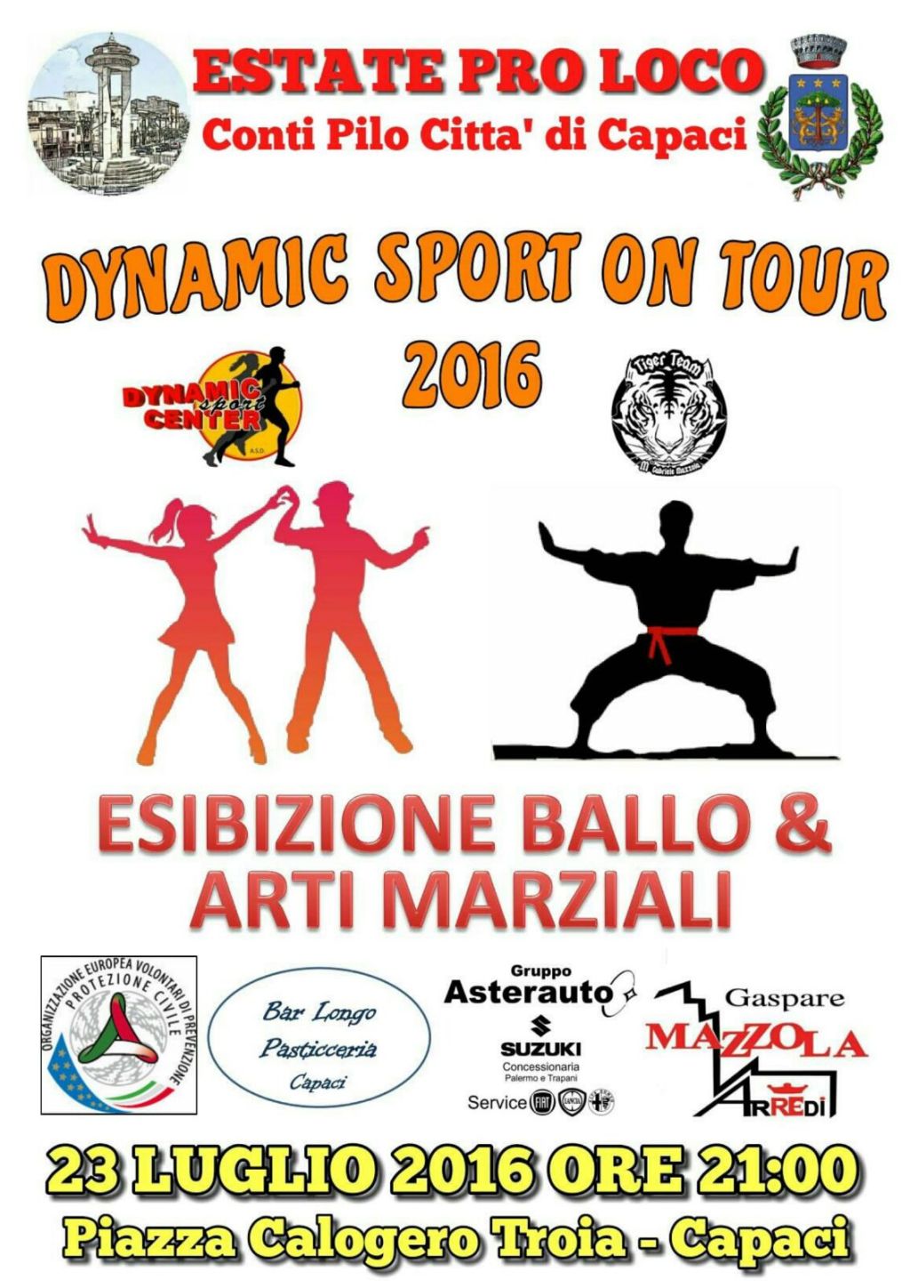 L’A.S.D. Dynamic Sport Center presenta la prima tappa del “Dynamic Sport on Tour 2016”, una manifestazione sportiva itinerante con lo scopo di promuovere lo sport in tutte le sue discipline sempre nell’insegna del divertimento ,la prima tappa sarà presso il Comune di Capaci in collaborazione con la Proloco Contipilo Capaci il 23 luglio dalle 21 presso la Piazza Calogero Troia (ingresso gratuito).