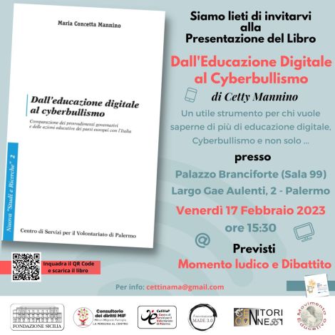 Venerdì 17 febbraio alle ore 15,30 presso Palazzo Branciforte, a Palermo, verrà presentato il libro dal titolo “Dall’educazione digitale al cyberbullismo”, distribuito gratuitamente in formato digitale e cartaceo (fino ad esaurimento), edito da Cesvop e scritto da Cetty Mannino, esperta in educazione digitale.