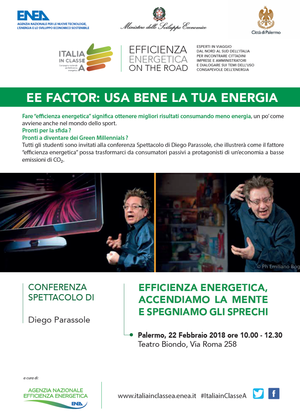 Sarà l’attore, scrittore e formatore Diego Parassole a coinvolgere e sensibilizzare i giovani dal palco del Teatro Biondo di Palermo, lanciando la sfida agli studenti illustrando come il fattore “e¬fficienza energetica” possa trasformarci da consumatori passivi a protagonisti di un’economia a basse emissioni di CO2.