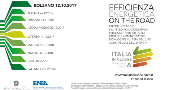 “Efficienza energetica on the road” nasce nell’ambito della Campagna Nazionale di comunicazione e sensibilizzazione “Italia in Classe A”, realizzata dall’ENEA in applicazione dell’art.13 del D.Lgs. 102/2014, per rafforzare l’interesse verso l’uso consapevole dell’energia e accelerare il processo di miglioramento dell’efficienza energetica attraverso una migliore conoscenza degli strumenti e delle opportunità del settore. Dopo Bolzano, Torino, Ferrara, Ascoli Piceno, Viterbo, Matera, Napoli, Bari e Palermo il Road Show farà la sua ultima tappa a Roma.