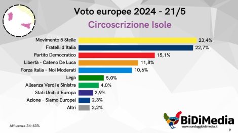 In testa in Sicilia si registrerebbe il ritorno del Movimento 5 stelle con il 23,4%. uno schiaffo a chi considerava i pentastellati ormai morti e sepolti” elettoralmente parlando. Lieve flessione ma ottimo secondo posto per Fratelli d’Italia con il 22,7% seguiti dal Pd con un 15% inatteso.