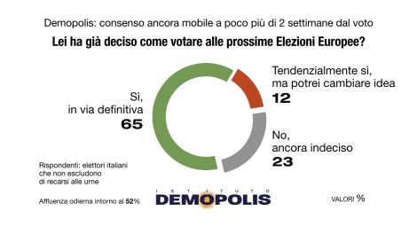 A poco più di 2 settimane dal voto per le Europee, il consenso appare ancora del tutto incerto. Se è vero che l’affluenza alle urne sarà scarsa, anche fra coloro che contano di andare a votare le scelte non sembrano ancora fatte e almeno un terzo dei votanti potrebbe cambiare idea nelle ultime due settimane. Tra quanti immaginano di recarsi alle urne, solo il 65%, meno di 2 italiani su 3, ha già un orientamento preciso; il 23% è ancora del tutto indeciso sulla scelta. Il 12% esprime oggi un’intenzione di voto, ammettendo però che potrebbe cambiare idea nei prossimi giorni.