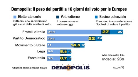 È lo scenario che emerge dall’ultima indagine condotta dall’Istituto Demopolis, prima del black out sui sondaggi elettorali previsto dalla legge in vista del voto dell’8 e 9 giugno.