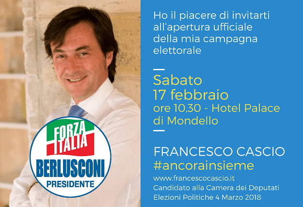 Sabato 17 febbraio alle 10.30 all’Hotel Palace di Mondello (Palermo) si svolgerà l’evento di apertura della campagna elettorale di Francesco Cascio, candidato di Forza Italia per la Camera dei deputati nel collegio uninominale Palermo Resuttana San Lorenzo-Capaci.