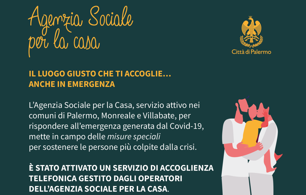 L’Agenzia sociale per la Casa, che opera nei Comuni di Palermo, Monreale e Villabate, nell’ambito delle misure volte a contrastare l’emergenza Covid19, ha attivato un servizio unico di assistenza telefonica per le famiglie con lo scopo di far conoscere tutte le modalità di sostegno messe in atto sia a livello locale dalle otto Circoscrizioni del Comune di Palermo, che nazionale. Il numero verde 800567999 sarà attivo da lunedì al venerdì dalle 8.00 alle 20.00.