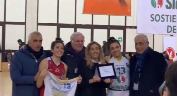 Un grande abbraccio tra le tre atlete, legate non solo da un vincolo familiare ma anche da una grande passione, il basket, ha tolto il fiato al pubblico. Sulle note di “Viva la mamma” si è riunita la dinastia del basket palermitano. Le due sorelle Marta e Costanza hanno consegnato nelle mani della madre una targa alla presenza del presidente della società Adolfo Allegra e con Tommaso Dragotto, presidente del main sponsor Sicily By Car.