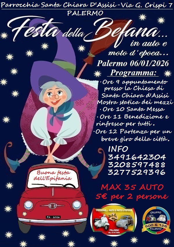 In data 06 Gennaio 2026 in occasione dell’Epifania, il gruppo Passione…auto e moto d’epoca Palermo e il gruppo Passione Fiat 500 & 126 Palermo organizzano una Santa Messa con l’arrivo dei 3 Re Magi alle ore 10 presso la Parrocchia Santa Chiara D’Assisi in Via G. Crispi di Palermo seguita da un rinfresco nell’ atrio della Parrocchia per tutti grandi e piccini a base di caramelle, panettone e pandoro… successivamente i mezzi faranno una breve passeggiata per le vie della città con i mezzi d’epoca.