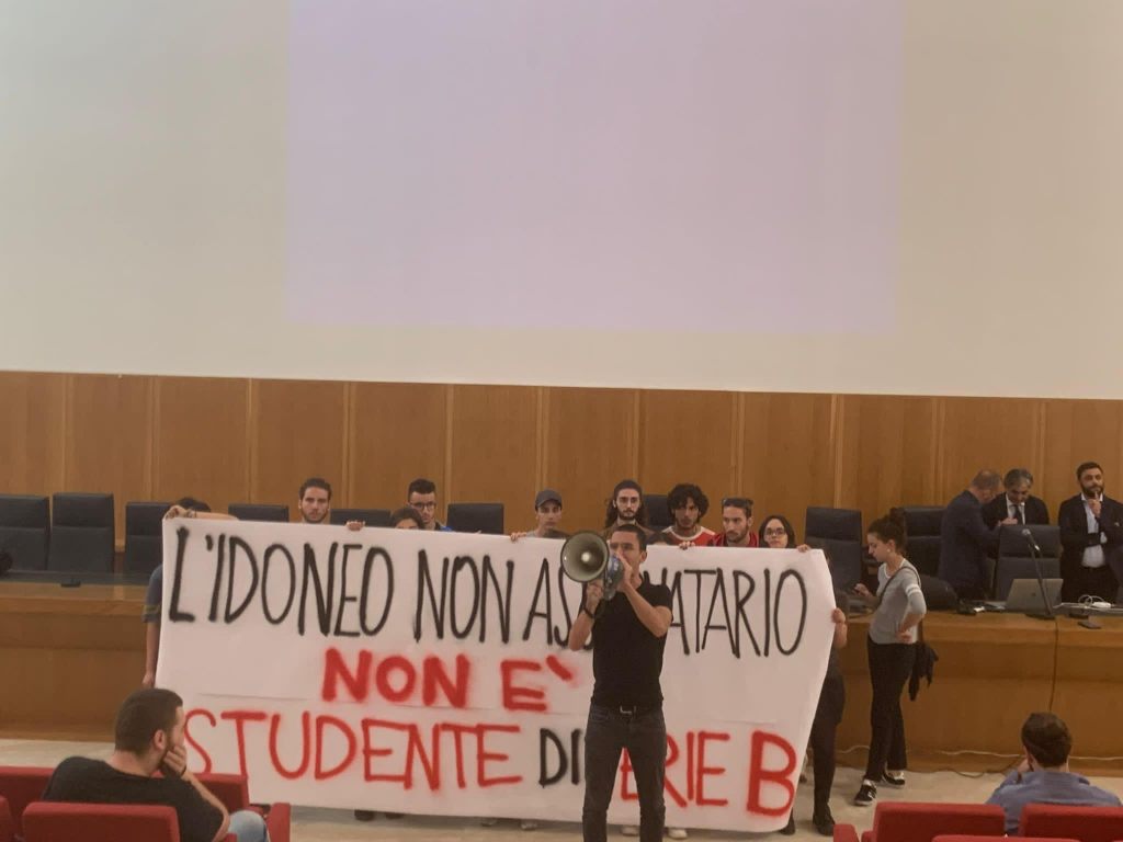 “L’idoneo non assegnatario non è uno studente di serie B” si legge nello striscione. Il riferimento è ai quasi mille studenti che anche quest’anno sono risultati idonei per Isee e per merito a ricevere il posto letto all’interno dei pensionati, ma non assegnatari per carenza di spazi. Proprio la proposta da parte dei corsi di laurea di Architettura di Palermo e di Madrid, di aprire nuove residenze universitarie nel cuore del quartiere Albergheria di Palermo era il tema principale del convegno.