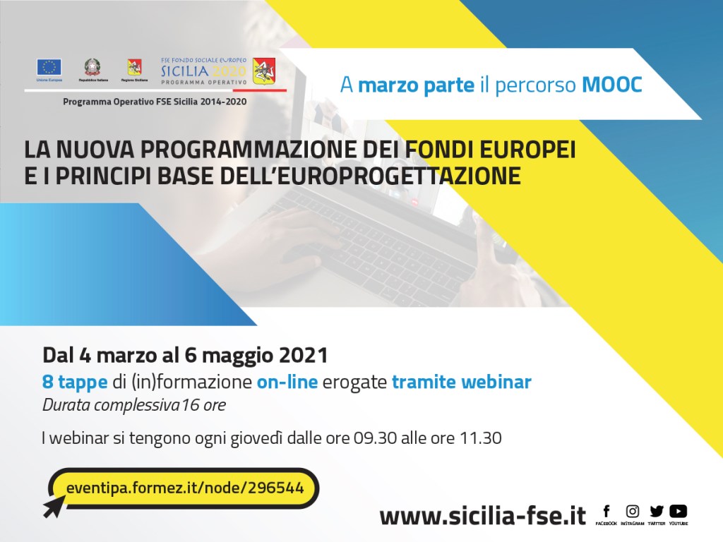 I webinar, rivolti a cittadini, enti locali, imprese, professionisti, potenziali beneficiari dei fondi europei e giornalisti, si svolgeranno tutti i giovedì dal 4 marzo al 6 maggio 2021. L’iniziativa fa parte della strategia di comunicazione del PO FSE Sicilia 2014-2020 e ha l’obiettivo d’informare i cittadini sulla nuova programmazione europea, sul ruolo dell’Ue, le sue politiche e sull’impatto dei fondi europei, in particolare quelli Fondo Sociale Europeo.