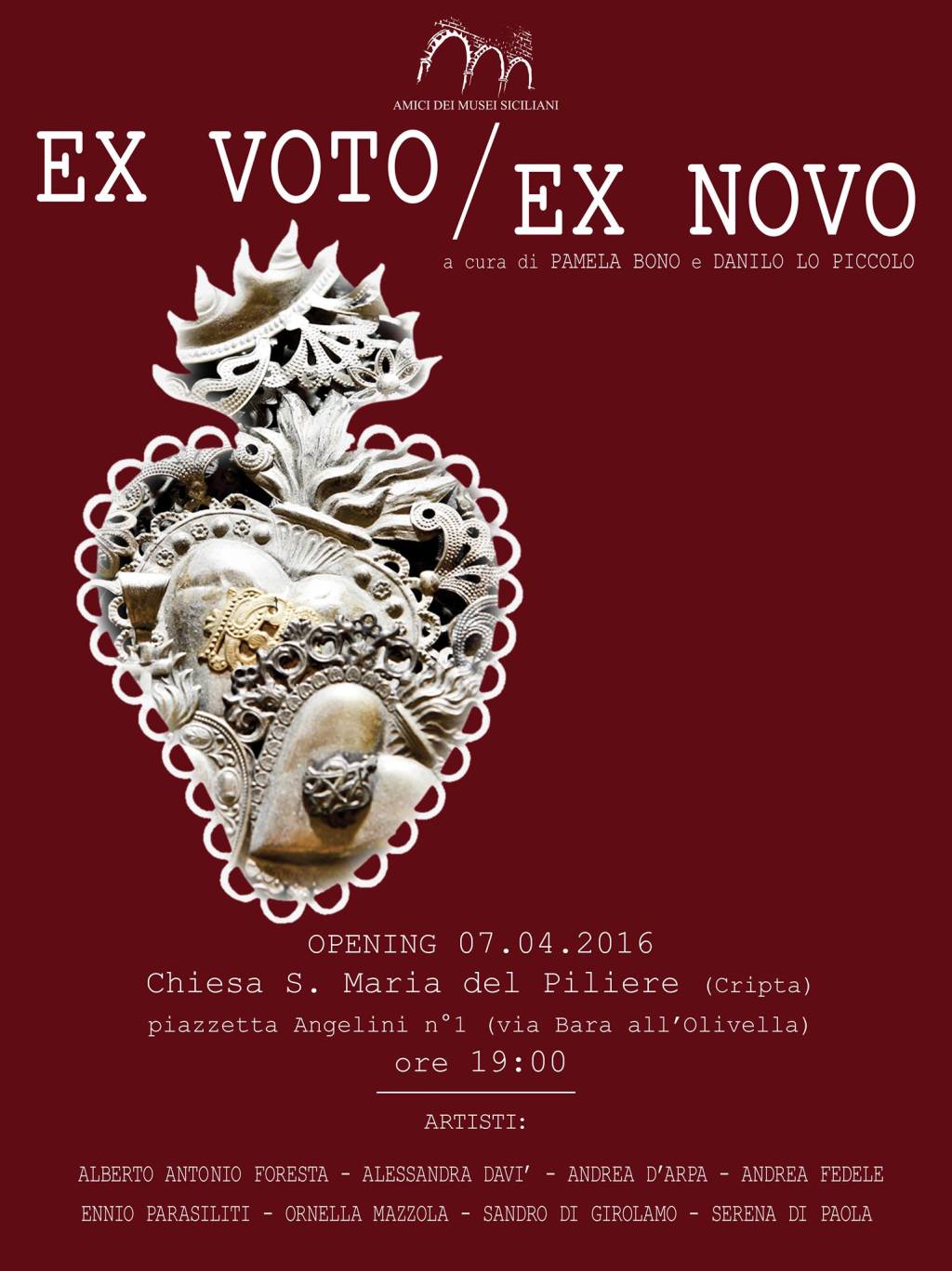 Giovedì 07 aprile 2016, alle ore 19,00 aprirà per la prima volta le proprie porte all’arte contemporanea la cripta di S. Maria del Piliere a Palermo, con la mostra EX VOTO/ EX NOVO. Progetto ideato e curato da Pamela Bono e Danilo Lo Piccolo, in cui verrà indagato grazie all’ausilio di una collettiva di artisti siciliani, l’ex-voto, oggetto che «diviene ponte tra una vecchia generazione ed una nuova cultura espressiva». Utilizzati i più disparati mezzi, tecniche e materiali, gli artisti: Andrea D’Arpa, Alessandra Davì, Sandro Di Girolamo, Serena Di Paola, Andrea Fedele, Alberto Antonio Foresta, Ornella Mazzola e Ennio Parasiliti, fanno rivivere con gli occhi della contemporaneità uno dei simboli più misteriosi e atavici dell’uomo.