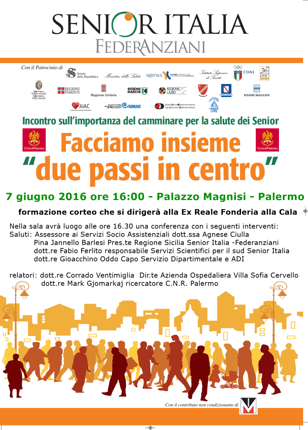 Si svolgerà a Palazzo Magnisi il 7 giugno prossimo “Facciamo due passi in centro”, campagna di sensibilizzazione organizzata dalla Senior Italia FederAnziani per l’attività fisica e la qualità della vita dei senior .
