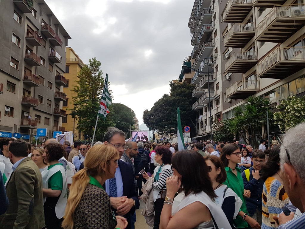 Il corteo, partito dall’aula bunker dell’Ucciardone, percorrendo via Duca della Verdura, arriva in via Notarbartolo, davanti al palazzo in cui abitavano il magistrato e la moglie Francesca Morvillo, dove, però, non giungerà un altro corteo partito dalla facoltà di Giurisprudenza. Sul palco Maria Falcone e, tra gli altri, Piero Grasso, collega e amico del magistrato ucciso a Capaci. La manifestazione è organizzata dalla Fondazione Falcone.