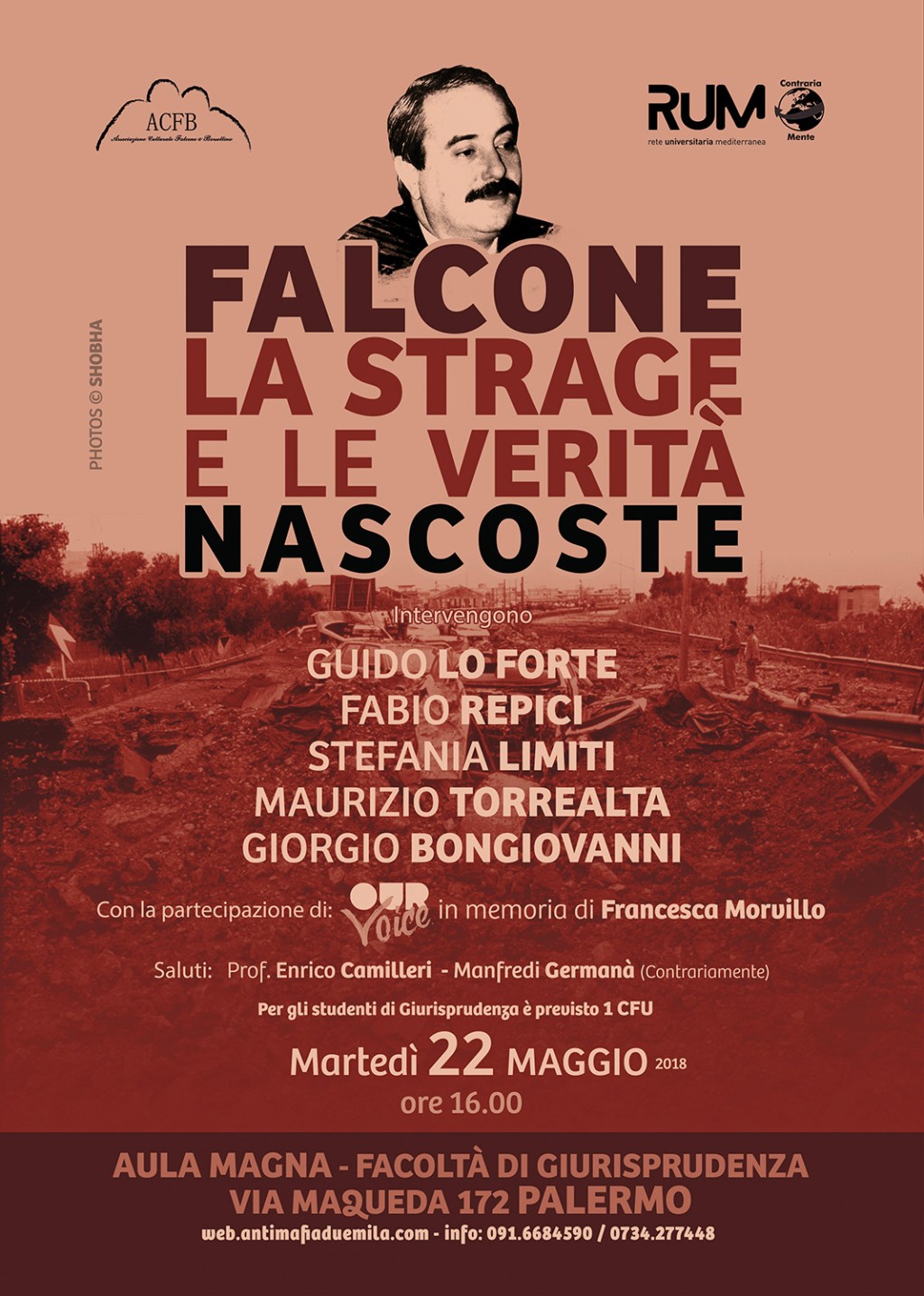 Palermo, martedì 22 maggio 2018 ore 16.00, presso l’Aula Magna della Facoltà di Giurisprudenza (via Maqueda, 172) in occasione del 26° anniversario della strage di Capaci avrà luogo la conferenza “Falcone, la strage e le verità nascoste”. L’evento è organizzato dall’Associazione culturale Falcone e Borsellino in collaborazione con la Rete Universitaria Mediterranea e ContrariaMente.